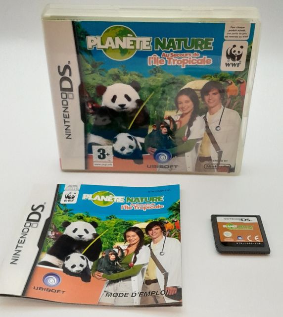 LA FAMILLE NINTENDO DS (DS, DSi, DSLite): LE FUTUR AU BOUT DES DOIGTS Planète Nature : Île Tropicale Nintendo DS |  | Jeu | : | Planète Nature : Île Tropicale (Nintendo DS). | | Contenu | : | Complet (Boîte + Cartouche + Manuel d'origine). | | État Global | : | Très bon (Boîtier propre, cartouche sans sable, manuel impeccable). | | Vibe | : | +300 en écologie et +100 en "Vacances virtuelles sous les cocotiers". | Connu aussi sous le nom de National Geographic: Panda ou similaire dans d'autres pays), c'est le jeu parfait pour ceux qui voulaient jouer les gardes-forestiers en herbe. Tu t'occupes d'animaux exotiques, tu explores une île paradisiaque et tu sauves la biodiversité depuis ton canapé.