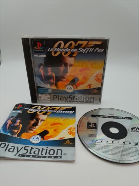 PS1 - LA NOSTALGIE PUR JUS 007 Le monde ne suffit pas Platinum PS1 |  | Jeu | : | 007 : Le Monde ne suffit pas (Édition Platinum). | | Contenu | : | Complet (CD + Manuel d'origine). | | État Global | : | Excellent (Disque miroir, manuel nickel et boîtier qui tient la route). | | Vibe | : | +250 en infiltration tactique et +100 en charisme à la britannique. | Le Monde ne suffit pas (The World Is Not Enough), l'adaptation du film avec Pierce Brosnan. Contrairement au précédent, ici on est sur du FPS (tir à la première personne) pur et dur. C'était un peu le "GoldenEye" de la fin de vie de la PS1, avec des gadgets, des fusillades et des cinématiques qui nous faisaient croire qu'on était au cinéma.